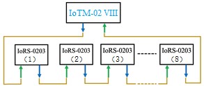 本產(chǎn)品所有節(jié)點包括IoTM-02 VIII和8個IoRS-0203都以手挽手模式組成一個通訊閉環(huán):IoTM-02 VIII的“RS出”接口與第一個IoRS0203的“RS485 In”接口相連接,中間IoRS-0203的“RS485 Out”接口分別與下一個IoRS的“RS485 In”相連,以此類推,并且最后一個IoRS-0203的“RS485 Out”接口與IoTM-02 VIII的“RS入”相連,這樣形成一個通訊閉環(huán)。